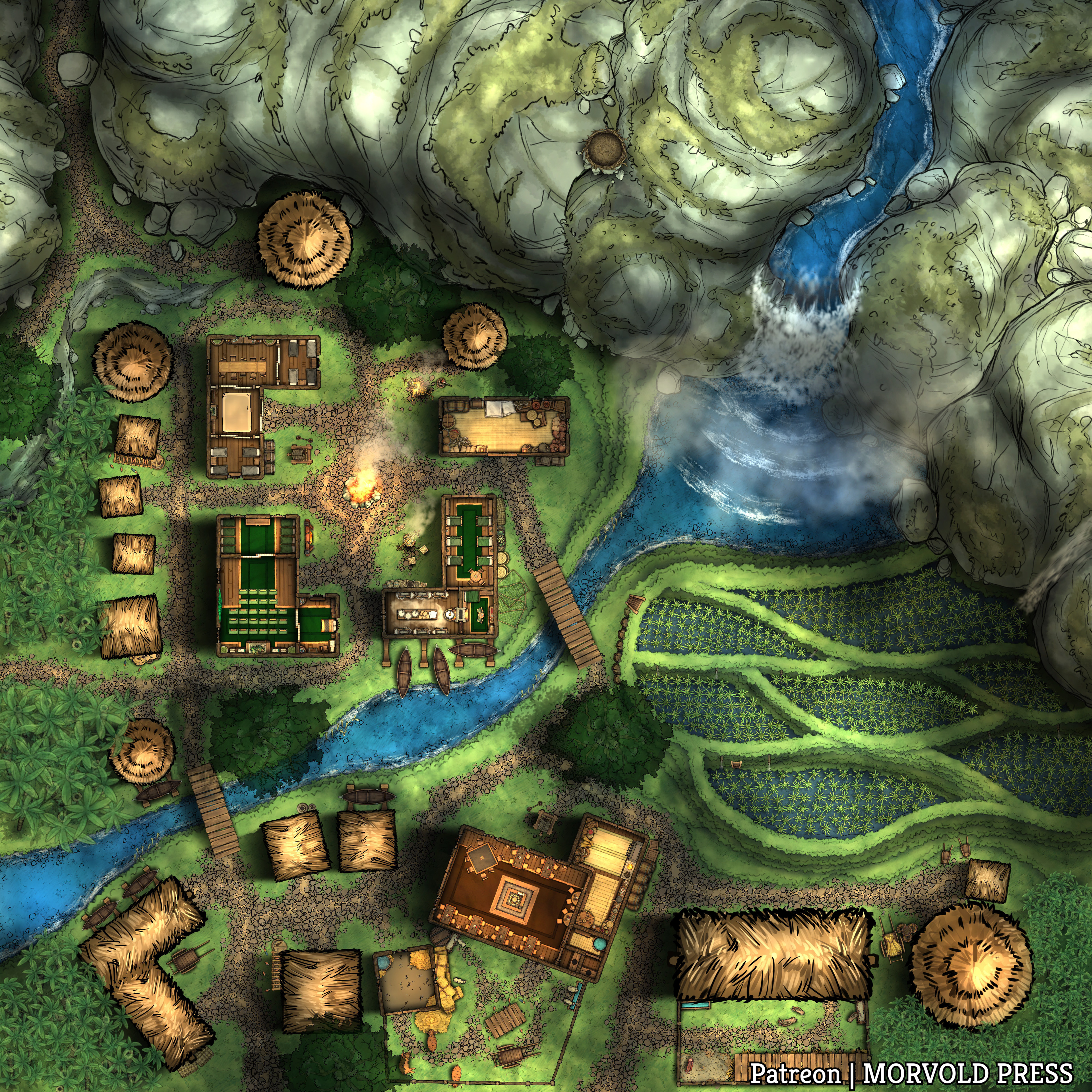 This village map features a variety of points of interest, including a majestic waterfall, flowing river, straw huts, rice paddies, bamboo forests and a few interior locations that the PC's can explore on their travels. This village can be used as it appears, a simple fishing village, or as I intend for it to be used -- as the front of the Shadow Dragon Ninja clan, whom operate both the village and the training facility located behind the waterfall.