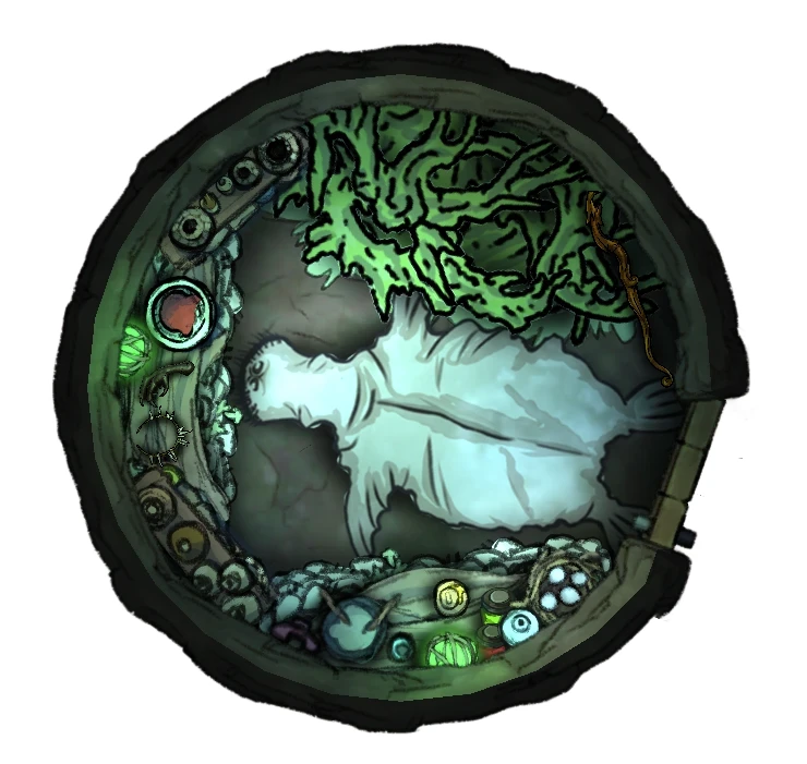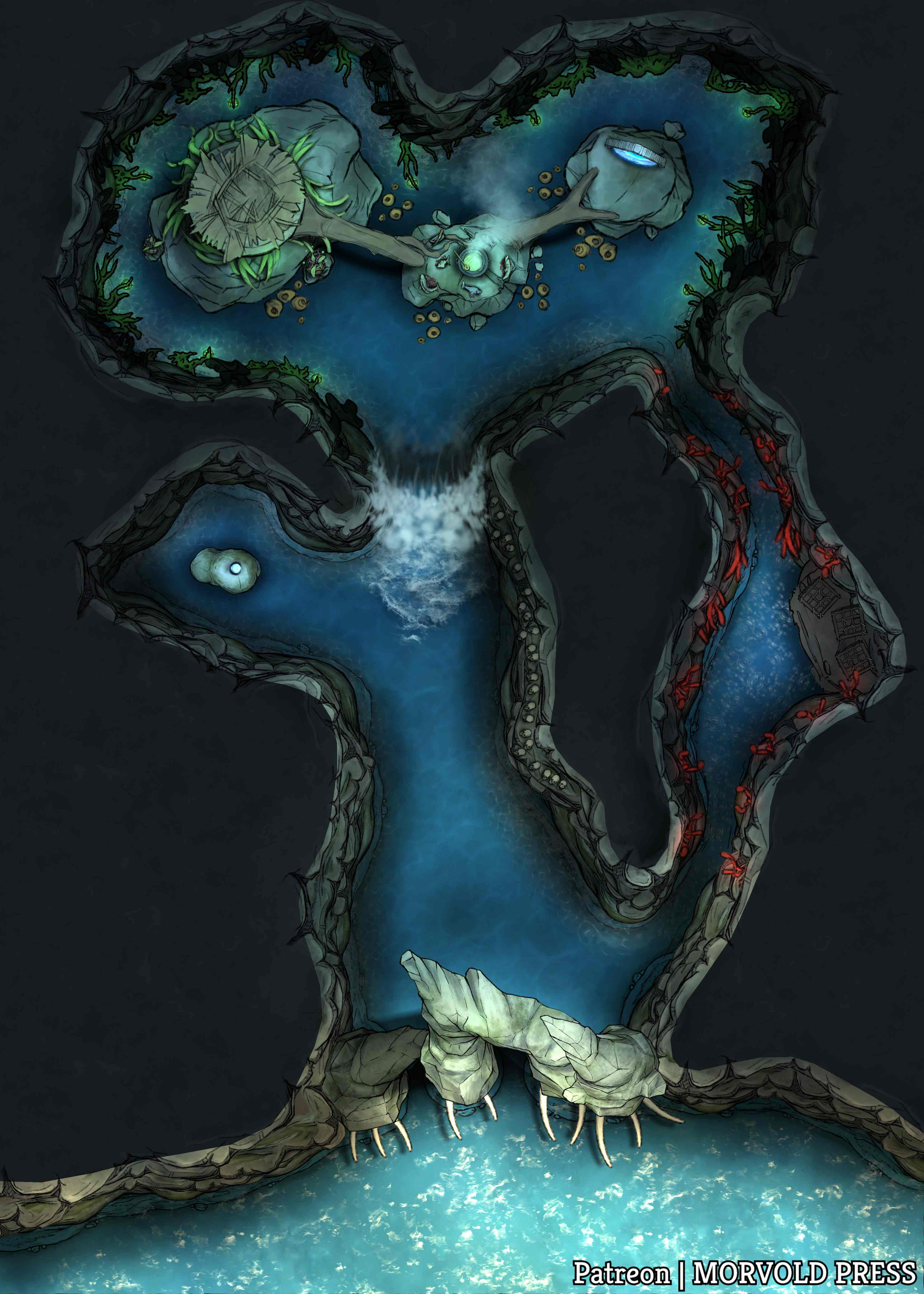 The Sea Witch's Lair is at the back of the cavern, past the magical wall of water, and is comprised of three small stony islands rising from the waters. Her hut sits atop the leftmost island, with large pieces of driftwood forming a bridge toward the other two. The central island holds the witch's cauldron and several dead fish, gutted and apparently used in some type of ritual. The right-hand island has an archway made of polished coral bricks that contains a glowing blue portal, shimmering like sunlight on the ocean.